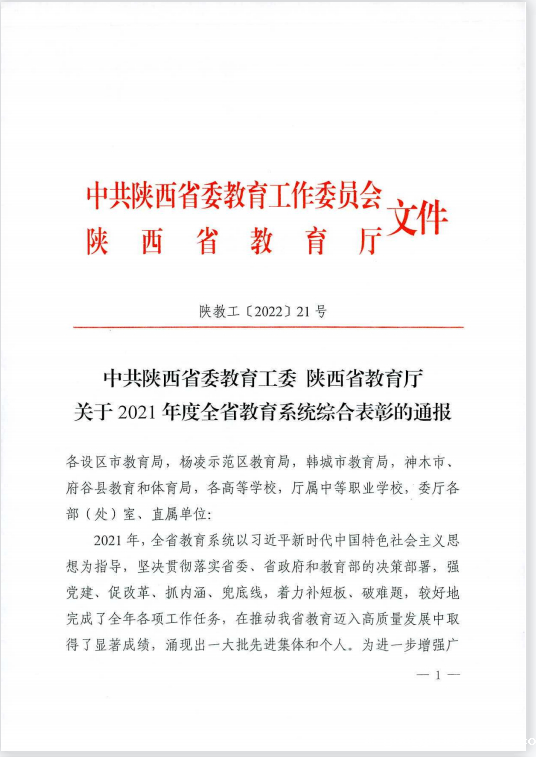 近日,中共陕西省委教育工委陕西省教育厅公布了2021年度全省教育系统综合表彰结果,我院刘梅老师获评“2021年度陕西高等学校本科教学管理工作先进个人”。